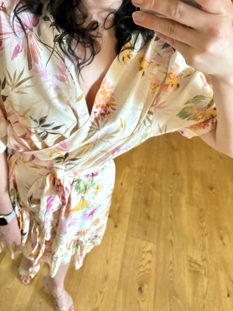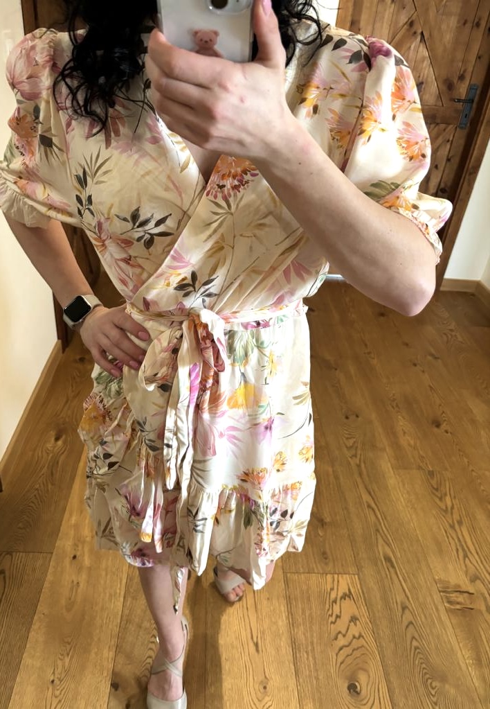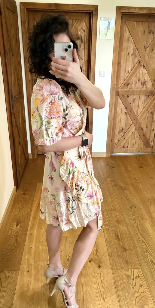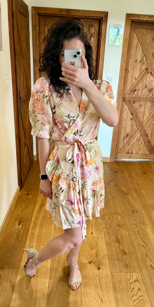 Kremowa sukienka w kwiatowy wzór, wykonana z wiskozy, to super propozycja na wiosnę i lato! Naturalny materiał idealnie sprawdzi się w cieplejsze dni. Wiązanie w pasie pozwoli dopasować ją do wielu sylwetek. Sukienkowa propozycja na chrzciny, komunię czy panieński.