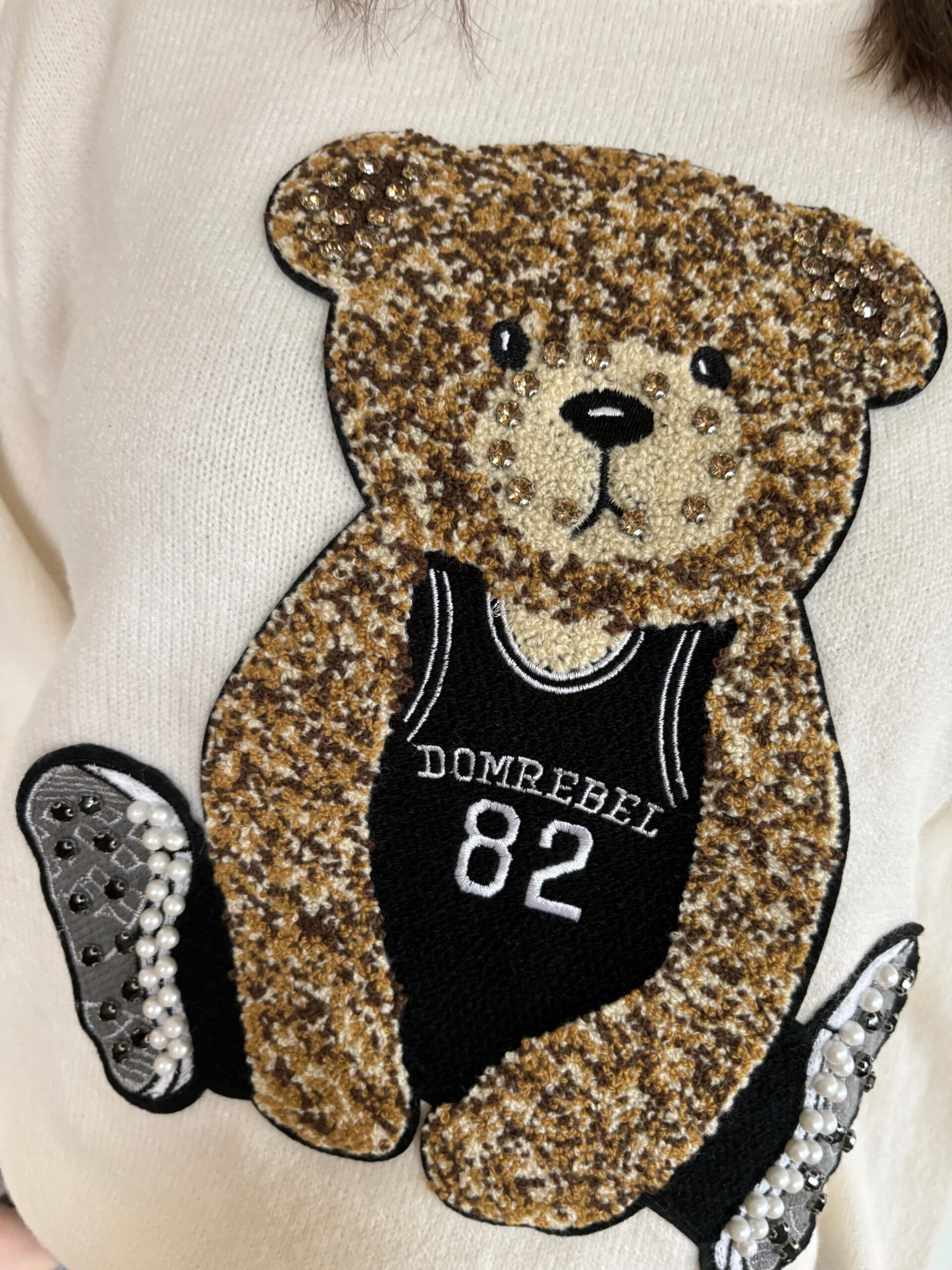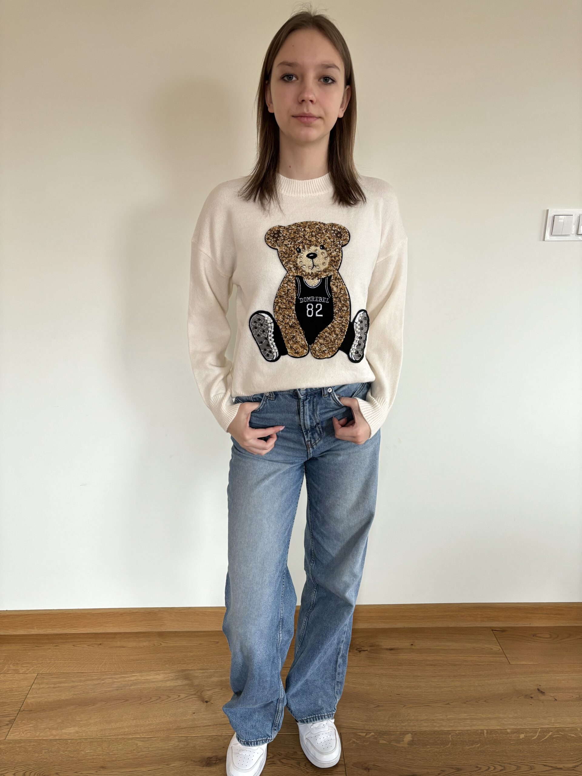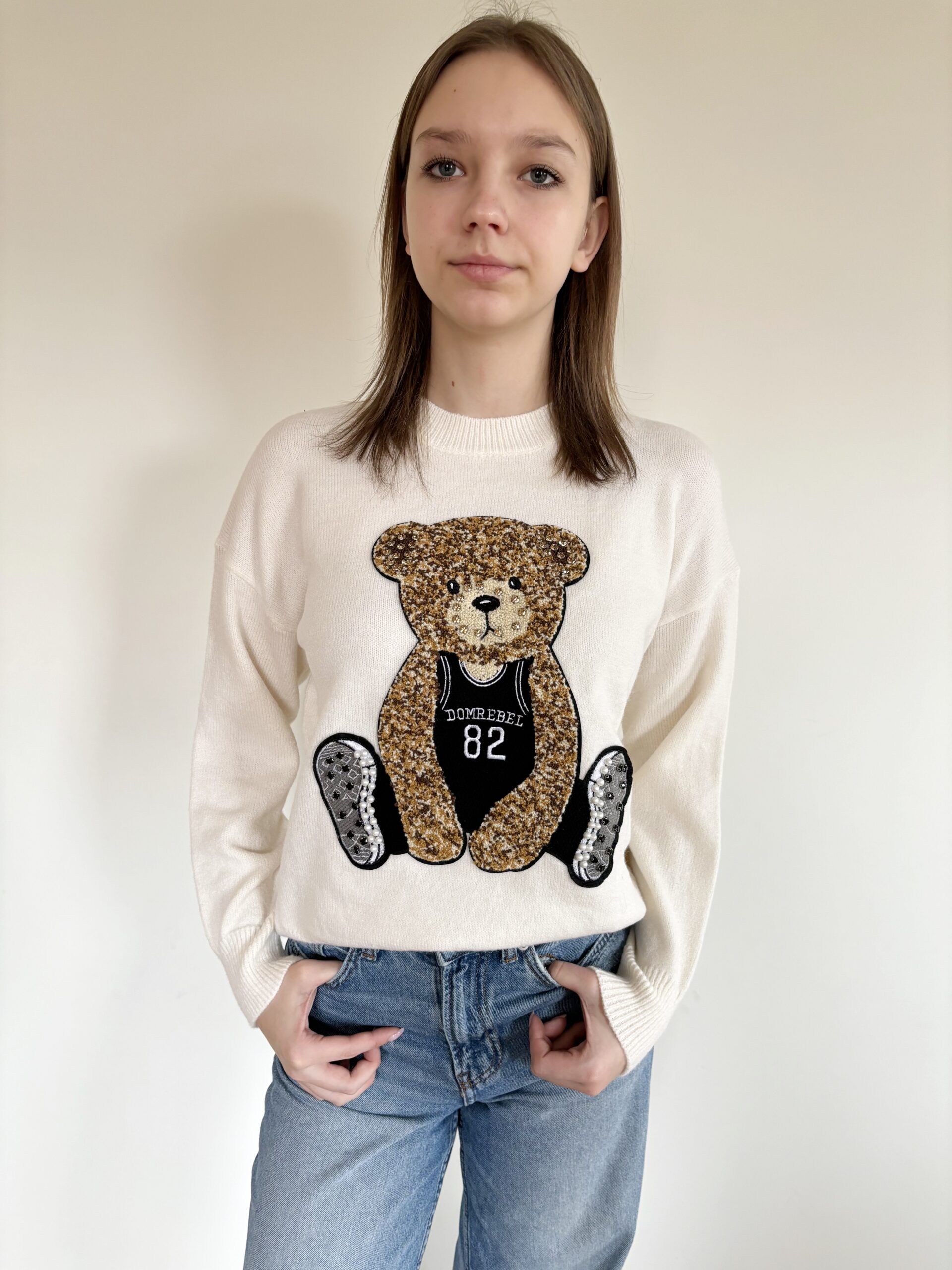 Sweter z bardzo modną w tym sezonie aplikacja – misiem. Przyjemny, nie gryzący materiał, model z długim rękawem, idealny na wiosnę do spodni czy spódniczki. Przywołuje wiosnę.  Miś posiada biżuteryjne akcenty.
